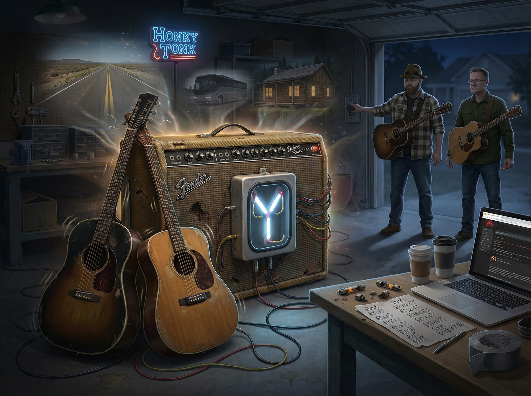 Some inventions are built on science; this one was built on three chords and the truth.In 2021, Blake and Dave weren’t trying to invent time travel. They were trying to understand why certain songs felt older than they were—why some chords carried weight that didn’t belong to the present.They were in a garage with two acoustic guitars and an old Fender Deluxe Reverb that hummed like it had stories left in it. The tweed was worn. The tubes ran warm. The reverb never went past five.Dave strummed a simple progression and let it ring.“You ever notice,” he said, “how some songs don’t belong to now?”Blake muted the strings slowly. “Define now.”“This room. This year. Us.” Dave shook his head. “Some of these songs feel like they’re bleeding in from somewhere else.”Blake looked at the amp. “What if they are?”That question didn’t get laughed off. It didn’t get dismissed. It stayed.And once it stayed, it had to be tested.They started with theory. Resonance. Frequency overlap. They wired the acoustics straight into the Deluxe Reverb. Blake dug through schematics from places musicians don’t usually browse. Dave acquired a flux capacitor—yes, shaped exactly like the one from Back to the Future. Neither of them treated it like a joke.The first trials failed.Sometimes the amp screamed and cut out.